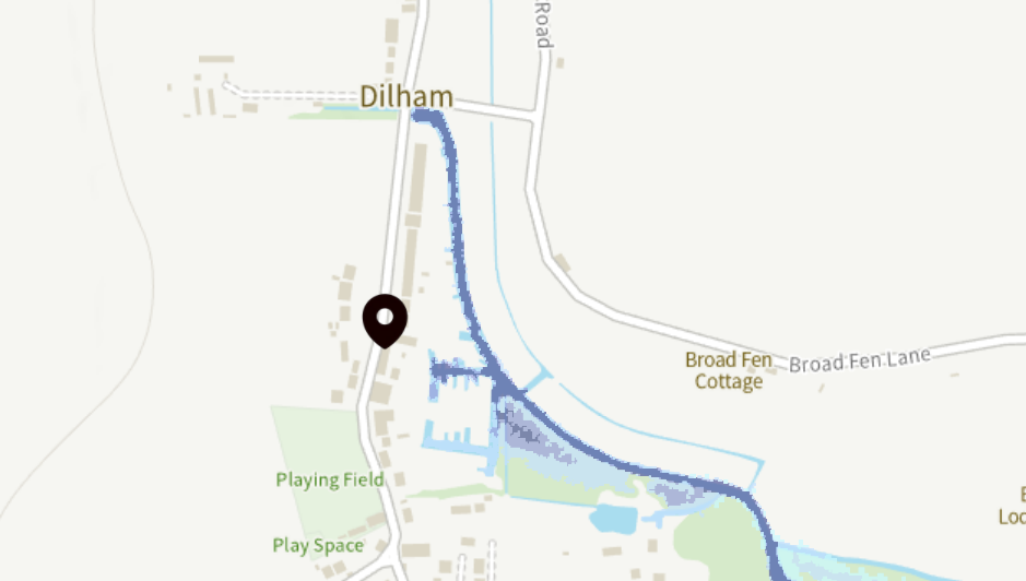 Canal aspect: This is more Norfolk Broads than I usually do, but I thought it was a nice one to include, as a freehold mooring comes up so rarely, especially a pair with a power supply. There are two plots here, with separate titles, being sold together. Tyler's Cut leads on to the River Ant and the Dilham Canal. The houses along the High Street all have a "very low" risk of flooding, with no change predicted, but the flood map shows a very small area around the mooring may be at risk.