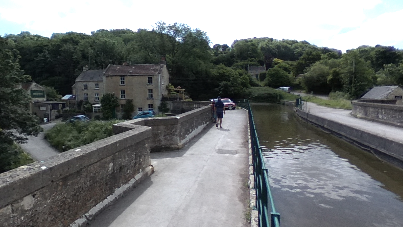 - Canal aspect: This property (the one with the green door) has iconic elevated views over the Kennet and Avon Canal, the amazing Avoncliff Aqueduct, and the River Avon below. Live here, and you'll be able to enjoy the No.10 Tea Room on the opposite bank, and The Cross Guns pub a few doors down. This pub has always been known along the K&A for its vibrant folk and acoustic music scene - it's recently under new ownership and management. Below is a Streetview image looking back at the house from the Aquaduct - it's the one in the middle, to the left of the light blue car.