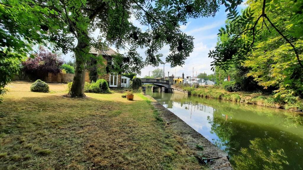 - Canal aspect: This one is on the offside of the River Stort Navigation (a canalised river, so it counts!) It has great mooring potential! The agent sensibly notes: "The historic mooring for this property is non-transferable, a new owner may be able obtain mooring, they would need to apply to the River Authority, The Canal & River Trust."