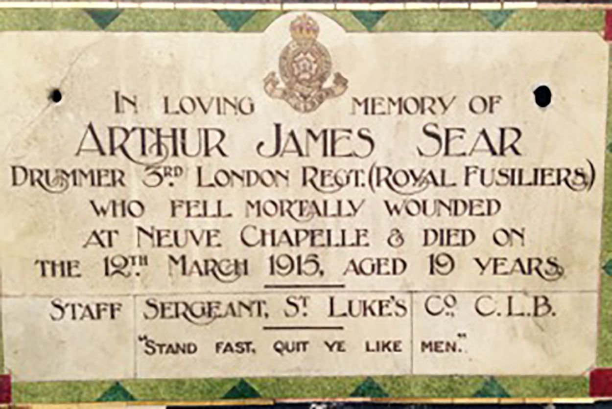 In loving memory of Arthur James Sear, Drummer 3rd London Regt (Royal Fusiliers} who fell mortally wounded at Neuve Chapelle and died on the 12th March 1915, aged 19 years. Staff Serjeant, St Lukes Co CLB. "Stand Fast, Quit Ye Like Men".