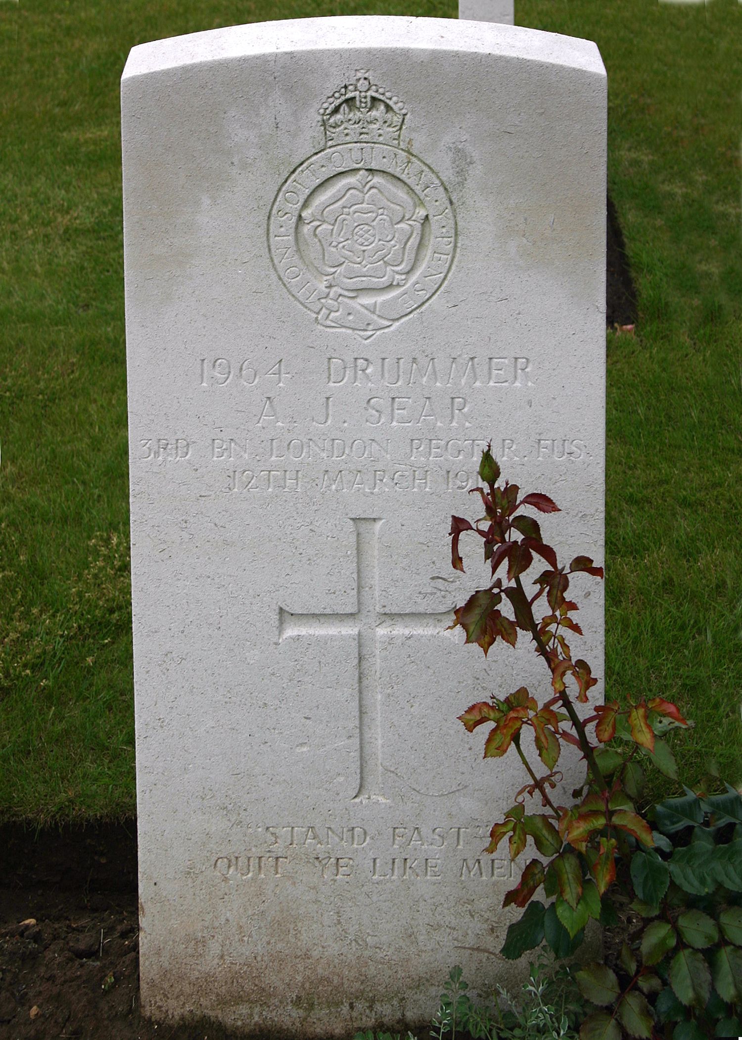 In loving memory of Arthur James Sear, Drummer 3rd London Regt (Royal Fusiliers} who fell mortally wounded at Neuve Chapelle and died on the 12th March 1915, aged 19 years. Staff Serjeant, St Lukes Co CLB. "Stand Fast, Quit Ye Like Men".