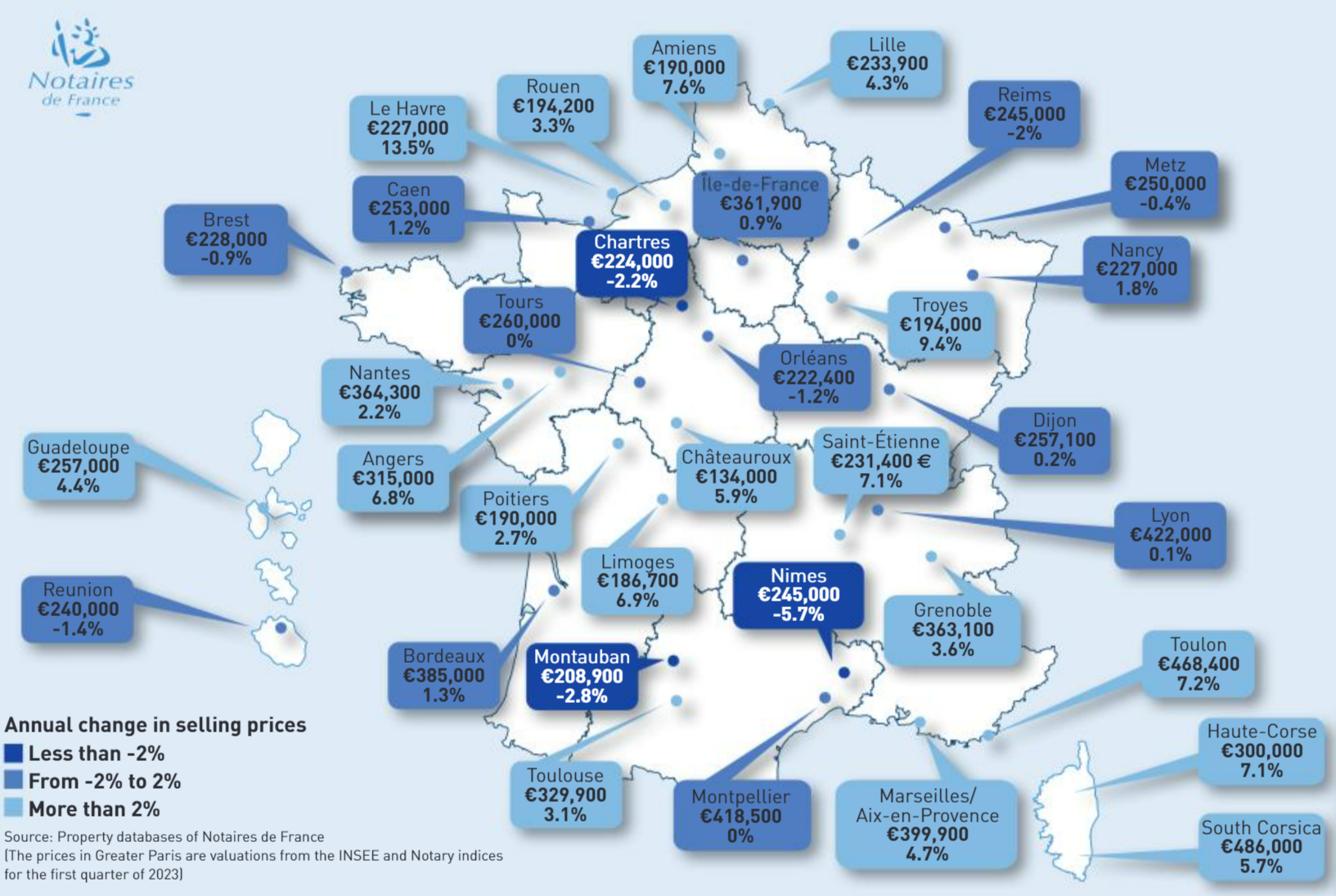 These dramatic increases have now slowed and the market is rebalancing. According to Notaires de France, a gradual deceleration of the price increases began around September 2022, and their projections from preliminary contracts at the end of July 2023 indicated that prices of old dwellings in metropolitan France were actually falling. It will be interesting to see what their next report reveals, as Notaires de France expected prices to decrease by 1% year-on-year.