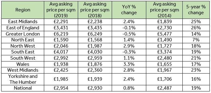 How do these prices compare to the UK? Well, in Feb 2020, Rightmove released a report (based on 2019 data) showing the different values per square metre across England and Wales. The study was based on an analysis of over nine million EPC records (Energy Performance Certificates) to calculate the average size of houses in an area, and the average asking prices of 1.2 million property listings. The research gave a national average asking price per square metre of £2,954. The most expensive area was the 'W' postcode in West London, which cost homebuyers a whopping 0,427 per square metre. The cheapest place per square metre was the SR postcode in Sunderland (£1,417).