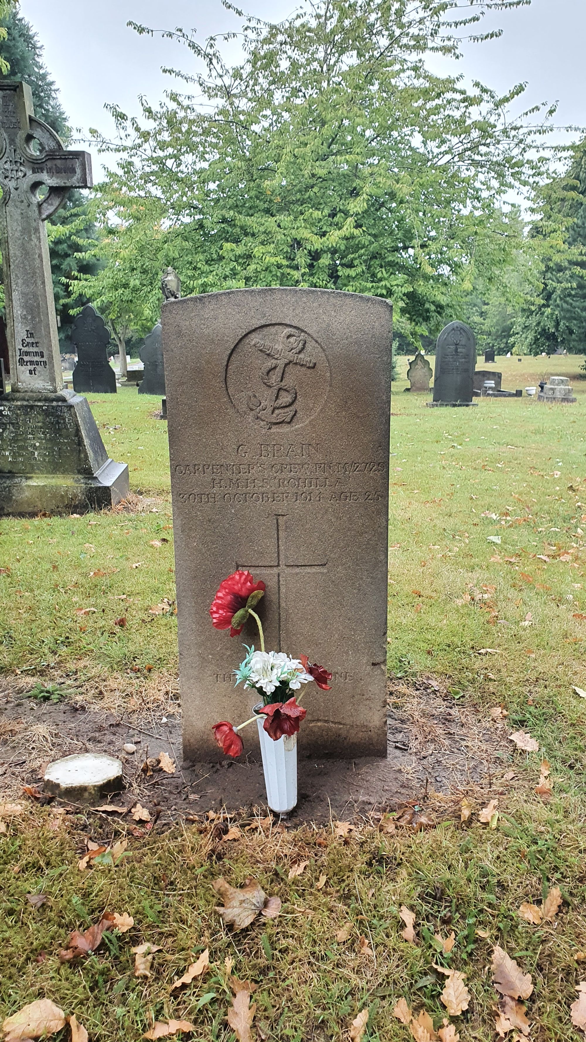 On 14th November 1914, the Tamworth Herald printed a photo of George, with the caption, "George Brain, of Glascote, who was drowned as a result of the wreck of the hospital ship Rohilla, off Whitby. The deceased served his apprenticeship at Messrs Musson and Sons of Glascote, and joined the Navy as ship's carpenter four years ago. After being at Chatham Naval Barracks for some three months he was appointed to HMS Antrim, and afterwards to HMS Shannon. At the outbreak of the war he was selected as one of the crew of the unfortunate hospital ship Rohilla, which was wrecked on the rocks off the Whitby coast on the 30th October last. A funeral service was held at St George's Church, Glascote, on Sunday evening, when special hymns were sung, and the Rev R W Morbey delivered an appropriate sermon. At the close the organist (Mr H Emery) played the 'Dead March' in 'Saul'."