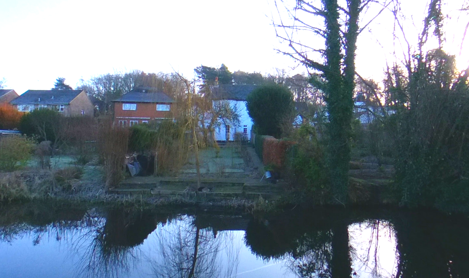 - Canal aspect: This backs onto the offside of the Basingstoke Canal. There appears to be quite a strong potential for applying for a short mooring here, subject to application - although the willow might prove a challenge! I'm pretty sure it's the one in the Streetview screenshot below - you can see the willow in the agent's photos.