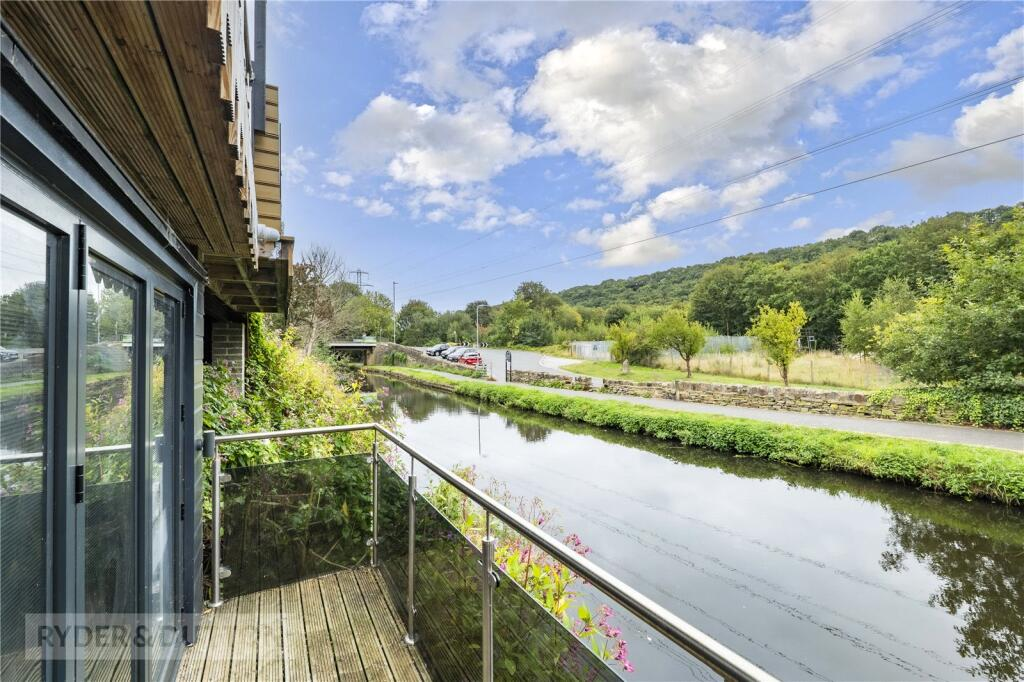 - Canal aspect: Classic "don't judge a book by its cover"! This house has a rear decking area and elevated views over the Calder and Hebble Navigation with sweeping woodland beyond. There are steps down to the water, where there is an extra balustraded deck, shown below. Maybe there's a small possibility of a very short mooring there.