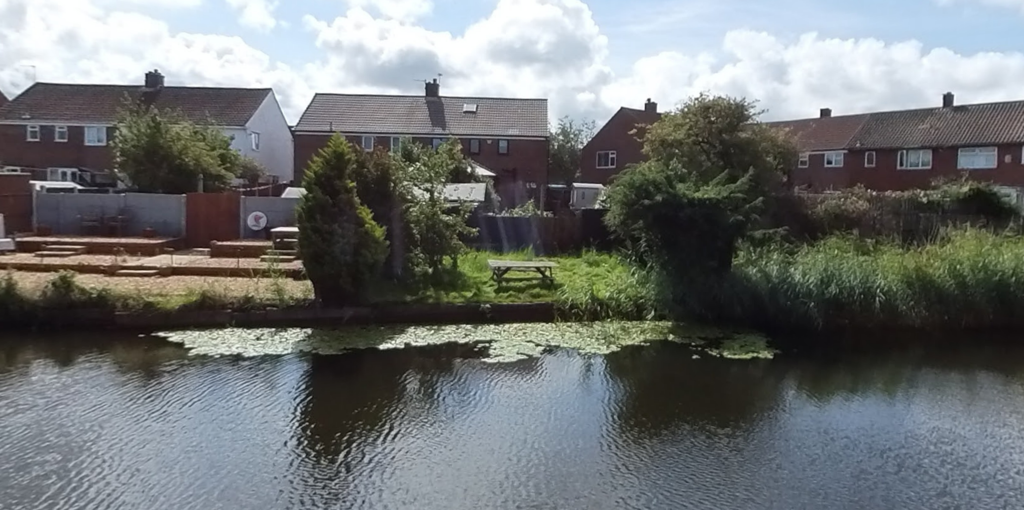 - Canal aspect: Goodness this has a lot to offer for the price. There is a good sized garden with lawn extending to the water's edge, on the offside of the Leeds and Liverpool Canal. It's the one with the table in the screenshot below. There is good potential for a short mooring - several neighbours have tupperware boats along here. On the opposite bank is the towpath and beyond that, the Rimrose Valley Country Park. Flood risk is marked as Very Low. Looking at the fencing line along here, the bottom part of all the gardens may be under a separate title. Something to check, but worst case scenario there may be a small garden ground rent to the CRT.
