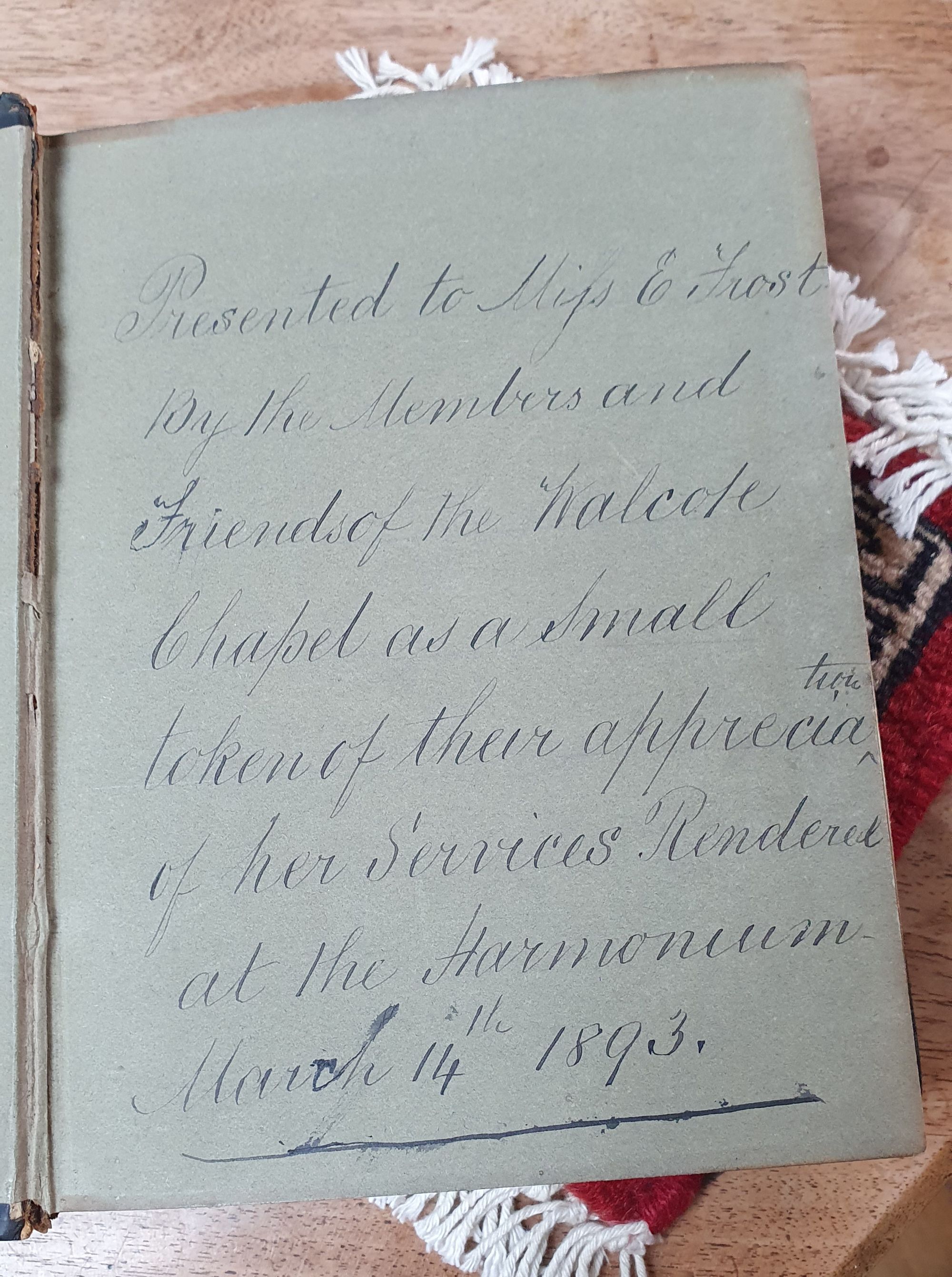 As a genealogist, I was equally excited, because inside the front cover, I found an inscription. It reads, "Presented to Miss E Frost by the members and friends of the Walcote Chapel as a small token of their appreciation of her services rendered at the harmonium. March 14th 1893."