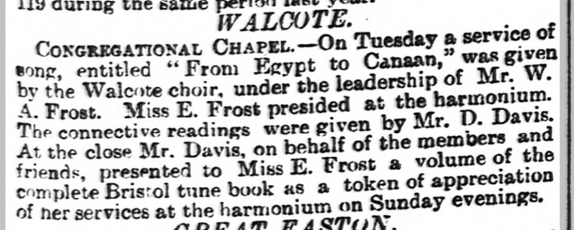 A Mr W Frost, presumably William, remained involved with Walcote Choir and Chapel. He was mentioned in October 1894, when he gave an address and led the choir at the Chapel's reopening services in October 1894. Miss E Cooke presided at the harmonium, as she had probably done since Lizzie's departure, or at least since July. Wr W Frost was mentioned again on several occasions between February 1895 and June 1897, when he was the Chapel's treasurer. Was William returning to visit family and maintain his relationship with the Chapel? It does seem likely. Or was this an unknown W Frost?