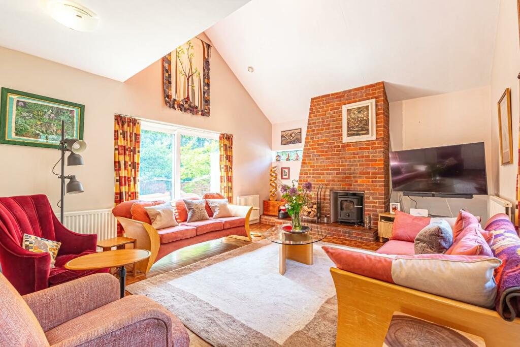 Lounge - Double glazed dual aspect windows. Patio door opening to the front courtyard. Cast iron log burner. Original parquet flooring. Radiator.