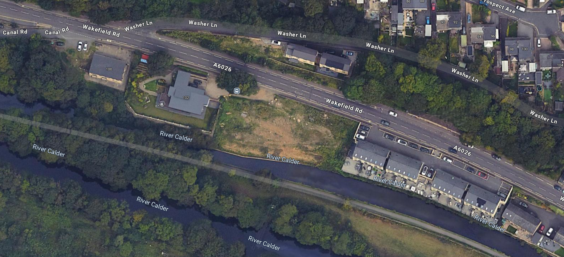 - Canal aspect: The plots back on to the Calder and Hebble Navigationwith what looks like a steep bank down to the canal. The agent has not supplied any photos of the site, so I have done my best with Streetview. Above you can see the view from the canal in 2022 (there are still trees on the bank), and below you can see it from above - I think this was in 2025.