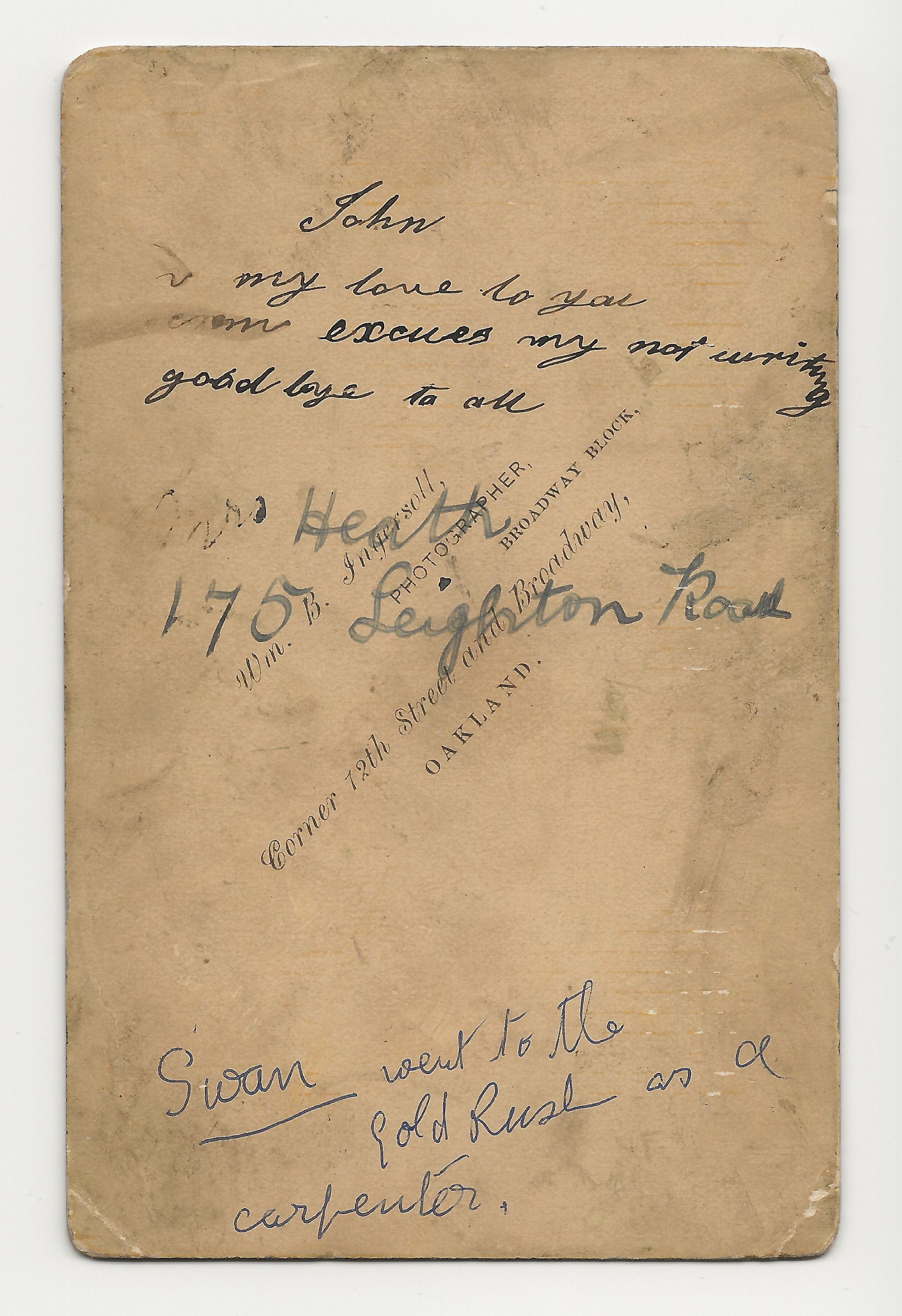 The family later moved to Oakland, California, where this photograph was taken, at William B Ingersoll's studio on the corner of 12th Street and Broadway, in Oakland.