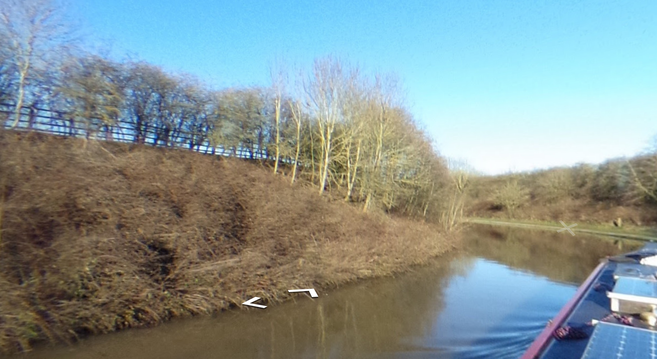 - Canal aspect: 6.67 acres plot, part of which overlooks an offside bank on the Worcester and Birmingham Canal. This is Grey Belt making it suitable for multiple dwellings. However, it appears from the plans that the property does not include the canal bank (this would need to be leased from the CRT), and the bank here is steep, on a loop, and extensively tree-lined (see Streetview screenshot below), which would make opening up the views and/or creating moorings a challenge. However, Withybed Moorings are a short walk away. Note that there will be some noise from the M42.