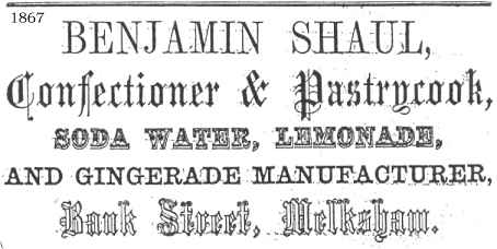 Benjamin Shaul had opened his first shop in Church Street, Melksham, some time before 1851. He married Sarah Alice Matthews, the daughter of an Inn Keeper, in Warminster in 1850. In 1861 Benjamin and Sarah can be found living in Market Place, Melksham, with Benjamin working as a confectioner. Staying with them at the time of this census were their nephew Frederick Bendy, age 3, and their niece Alice Blake, age 2, who would die only two years later.