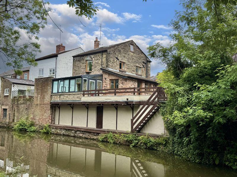 - Canal aspect: This barn (warehouse?) conversion is on the offside of the Peak Forest Canal. There is a canalside conservatory set high over the canal, and a large terrace with good views of the canal and the tree lined towpath opposite. Steps from the terrace lead down to the water's edge, where there is a narrowish deck, possibly suitable for a mooring application, but it may be too near the bridge and tunnel entrance. A door from the canalside deck open into a workshop.