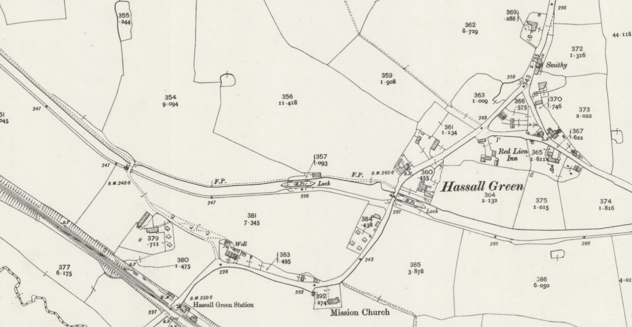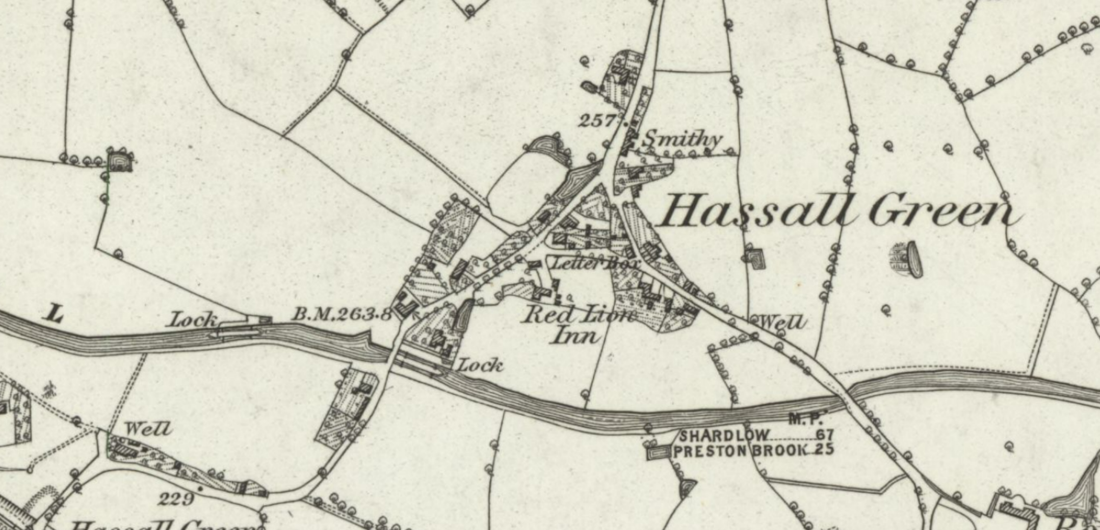 Hassall Green in Betchton, Cheshire. To be sold by auction by Messrs Lindop, at the house of Mr Richard Jinks, Red Lion Inn, Hassall Green, on Wednesday the 18th day of November 1863, at 6 o'clock in the evening, either together or in lots, as may be agreed on, and subject to conditions. All that messuage or dwelling house with the shop and other buildings, and yard, garden, or parcel of land, thereto belonging, situate and being at Hassall Green, in Betchton aforesaid, containing together by admeasurement 1453 square yards, and 2 feet, or thereabouts, now occupied by Mrs Mary Robinson, and bounded on the westerly side thereof by the public highway from Hassall Green, across the Trent and Mersey canal, to Hassall, an on the southerly side by a road adjoining the said canal. The above property is held on lease for the remainder of two lives, now aged respectively 28 and 31 years, under the annual rent of 3s 2d. It is in a good situation and well adapted for business. For further particulars apply to Mr Latham, solicitor, Sandbach.