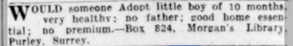 Percy remained with Minnie for ten months. In about March 1930 Charlotte saw an advert in the Kentish Express offering a child for adoption. I believe this is the advert (published 15th February 1930), although Charlotte said that the advert was placed by Mrs Walker, as Percy's mother could not afford to look after him.