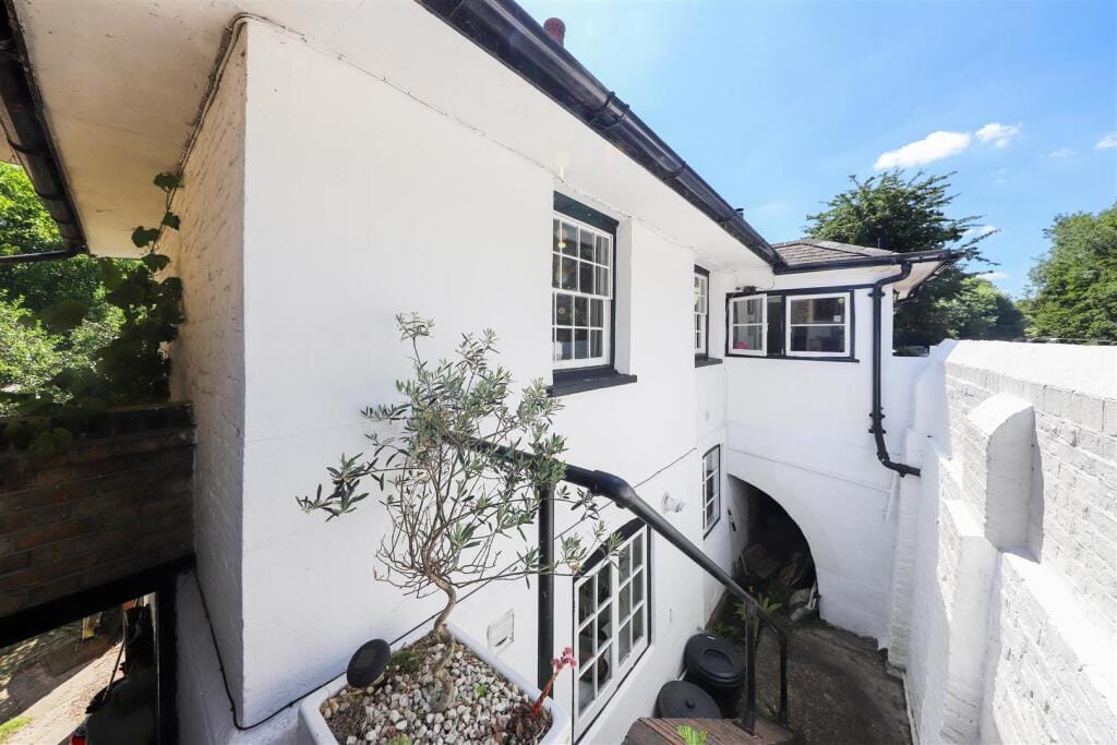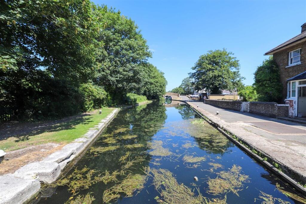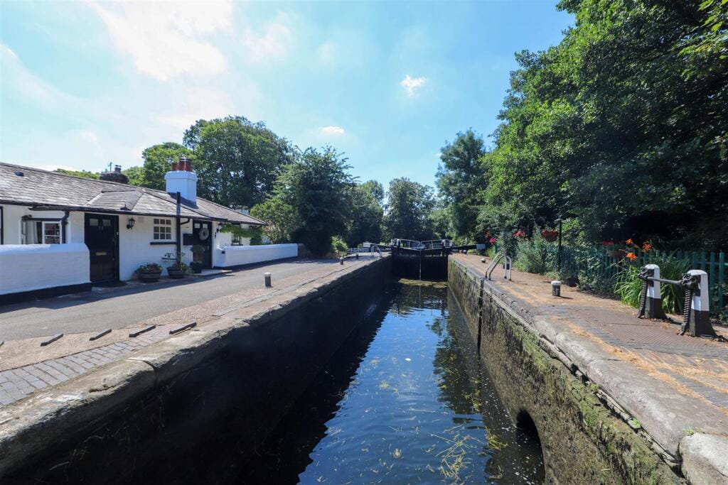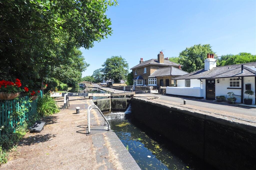 This attractive Grade II listed lock cottage at Cowley Lock, West London, was built in 1795 beside Cowley Lock, in Iver Lane, Uxbridge. It is one of three properties at the lock: two semi-detached cottages and a detached Toll House. The cottage offers historic charm with period details, in a tranquil semi-rural location with picturesque views of both the Grand Union Canal and the Frays River, which can be glimpsed through the trees on the opposite side of the lock.