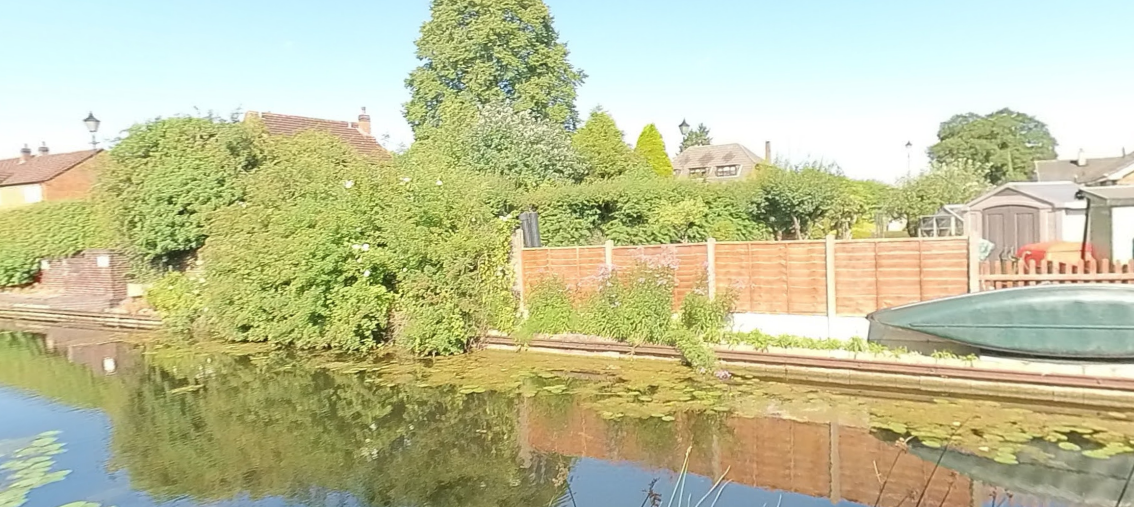 - Canal aspect: this one is hard to make out, but it seems to have a good length of offside edge, currently closed off, but with potential to open it up and perhaps achieve a mooring. The image below is from Streetview, and I believe the property is the part with all the bushes. The lamp is a good clue! Check with the agent for a site plan.